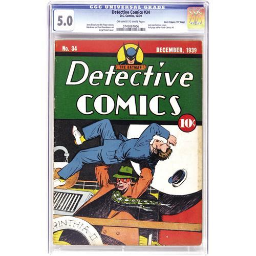 <B>Detective Comics #34 Davis Crippen ("D" Copy) pedigree (DC, 1939) CGC VG/FN 5.0 Off-white to white pages.</B></I> This was the last non-Batman cover of <B>Detective</B></I>'s long, illustrious, and still-continuing run! Creig Flessel is credited with the cover art, featuring a character generally thought to be the Crimson Avenger, who oddly enough doesn't appear inside the comic. As for the Batman story, there's some early continuity here, with the Caped Crusader still in Europe in the wake of his Hungarian adventure in #32 - he heads for Paris to take on the villainous Duc D'Orterre. Overstreet 2006 VG 4.0 value = $970; FN 6.0 value = $1,455. CGC census 6/06: 1 in 5.0, 5 higher. <I>From the Crippen Collection.</B></I> <BR><BR><B>Important notice:</B> Heritage usually auctions material at the rate of 200-250 lots per hour. On some occasions eBay Live bid software or the Internet may not be able to keep up with the pace of the auction. We recommend placing a realistic absentee bid now as insurance to avoid disappointment. Occasionally the auctioneer may eliminate or reject an eBay Live bid, and the auctioneer may also reopen a lot after the close of the eBay live bidding (usually because we missed an audience bid), and may reject your bid even if it shows you as the winning bidder. By bidding via eBay Live, you agree that Heritage may award the lot to another bidder at its sole discretion under the circumstances described above or any other reasonable circumstances. Since eBay bids are not shown to us until we open the lot on the floor, we treat those bids just like floor bids. In most cases the floor responds before the eBay bid is presented to us, due to Internet lag time, so for consistency we have made it a policy that floor bids are always considered first over tie eBay live bids. Also please note that all Heritage lots purchased through eBay Live carry a 22.5% Buyer's Premium. Please make sure you read the Terms and Conditions before you bid. This lot is being auctioned in conjunction with a live floor auction by Heritage Auction Galleries. All final auction and invoice information will be supplied by Heritage Auction Galleries, and all other information should be considered preliminary. Lot:41001 <BR><BR><B>Winning Notification and Billing:</B> After the FINAL session in this auction is complete, Heritage will send e-mail and snail mail invoices. This process normally takes several days. All final auction and invoice information will be supplied by Heritage Auction Galleries, and all other information should be considered preliminary. <BR><BR>This auction will be conducted on a live auction floor and over the Internet through eBay Live. If you choose to place an absentee bid, please take a moment to <font color='#0000ff'><u><a href='http://pages.ebay.com/liveauctions/help/before/laabsentee.html'>learn how eBay Live absentee bidding works</a></u></font><font color='#000000'>