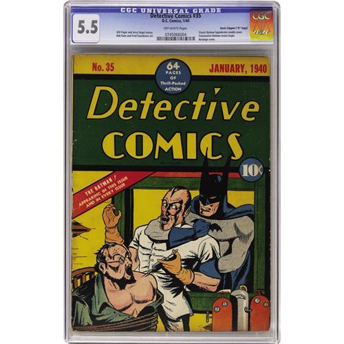 <B>Detective Comics #35 Davis Crippen ("D" Copy) pedigree (DC, 1940) CGC FN- 5.5 Off-white pages.</B></I> Just <I>one</B></I> copy of this book has been graded higher by CGC to date; combine that with the fact that copies of this issue always seem to have restoration if you can find one at all, and you have a book that will be circled in many a bidder's catalog. This issue marked the beginning of Batman's run as the permanent cover star of this title, a streak that's still going 66 years later! The issue is ranked among the 100 most valuable Golden Age comics by Overstreet, and among other things, it's famous for its splash panel, which shows Batman holding a smoking gun. Don't pass up this pedigree gem. Overstreet 2006 FN 6.0 value = $3,168. CGC census 6/06: 1 in 5.5, 1 higher. <I>From the Crippen Collection.</B></I> <BR><BR><B>Important notice:</B> Heritage usually auctions material at the rate of 200-250 lots per hour. On some occasions eBay Live bid software or the Internet may not be able to keep up with the pace of the auction. We recommend placing a realistic absentee bid now as insurance to avoid disappointment. Occasionally the auctioneer may eliminate or reject an eBay Live bid, and the auctioneer may also reopen a lot after the close of the eBay live bidding (usually because we missed an audience bid), and may reject your bid even if it shows you as the winning bidder. By bidding via eBay Live, you agree that Heritage may award the lot to another bidder at its sole discretion under the circumstances described above or any other reasonable circumstances. Since eBay bids are not shown to us until we open the lot on the floor, we treat those bids just like floor bids. In most cases the floor responds before the eBay bid is presented to us, due to Internet lag time, so for consistency we have made it a policy that floor bids are always considered first over tie eBay live bids. Also please note that all Heritage lots purchased through eBay Live carry a 22.5% Buyer's Premium. Please make sure you read the Terms and Conditions before you bid. This lot is being auctioned in conjunction with a live floor auction by Heritage Auction Galleries. All final auction and invoice information will be supplied by Heritage Auction Galleries, and all other information should be considered preliminary. Lot:41001 <BR><BR><B>Winning Notification and Billing:</B> After the FINAL session in this auction is complete, Heritage will send e-mail and snail mail invoices. This process normally takes several days. All final auction and invoice information will be supplied by Heritage Auction Galleries, and all other information should be considered preliminary. <BR><BR>This auction will be conducted on a live auction floor and over the Internet through eBay Live. If you choose to place an absentee bid, please take a moment to <font color='#0000ff'><u><a href='http://pages.ebay.com/liveauctions/help/before/laabsentee.html'>learn how eBay Live absentee bidding works</a></u></font><font color='#000000'>