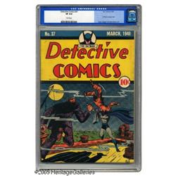 <B>Detective Comics #37 (DC, 1940) CGC VF 8.0 White pages.</B></I> This issue has Batman's last adventure of the pre-sidekick era, as the Caped Crusader takes on a foreign agent. The many backup features include superhero the Crimson Avenger (who actually had appeared in this title longer than Batman had), Speed Saunders, and Slam Bradley, as well as globetrotting adventurer Cliff Crosby, who made his first appearance in this issue. The book's artists include Bob Kane (who got some help from Jerry Robinson) and Fred Guardineer (who drew the Speed Saunders feature). Only two unrestored copies of this issue have been certified with higher grades by CGC to date. Overstreet 2004 VF 8.0 value = $4,585. CGC census 12/04: 1 in 8.0, 2 higher. <I>From the Northern Lights Collection.</B></I>