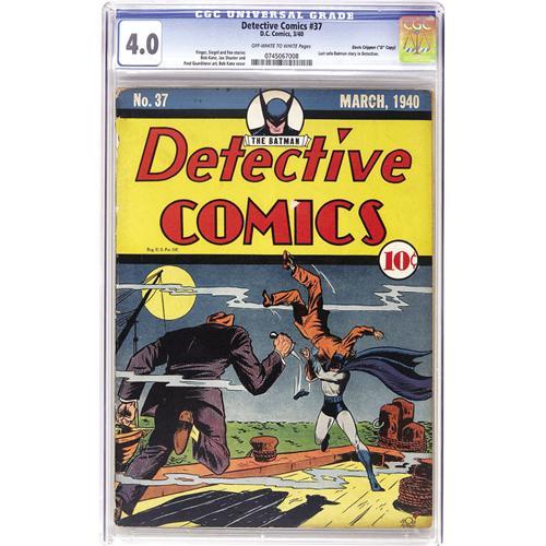 <B>Detective Comics #37 Davis Crippen ("D" Copy) pedigree (DC, 1940) CGC VG 4.0 Off-white to white pages.</B></I> This issue has Batman's last adventure of the pre-sidekick era! The many backup features include superhero the Crimson Avenger, Speed Saunders, and Slam Bradley, as well as globetrotting adventurer Cliff Crosby, who made his first appearance in this issue. The cover is credited to Bob Kane. Overstreet 2006 VG 4.0 value = $1,394. CGC census 6/06: 1 in 4.0, 6 higher. <I>From the Crippen Collection.</B></I> <BR><BR><B>Important notice:</B> Heritage usually auctions material at the rate of 200-250 lots per hour. On some occasions eBay Live bid software or the Internet may not be able to keep up with the pace of the auction. We recommend placing a realistic absentee bid now as insurance to avoid disappointment. Occasionally the auctioneer may eliminate or reject an eBay Live bid, and the auctioneer may also reopen a lot after the close of the eBay live bidding (usually because we missed an audience bid), and may reject your bid even if it shows you as the winning bidder. By bidding via eBay Live, you agree that Heritage may award the lot to another bidder at its sole discretion under the circumstances described above or any other reasonable circumstances. Since eBay bids are not shown to us until we open the lot on the floor, we treat those bids just like floor bids. In most cases the floor responds before the eBay bid is presented to us, due to Internet lag time, so for consistency we have made it a policy that floor bids are always considered first over tie eBay live bids. Also please note that all Heritage lots purchased through eBay Live carry a 22.5% Buyer's Premium. Please make sure you read the Terms and Conditions before you bid. This lot is being auctioned in conjunction with a live floor auction by Heritage Auction Galleries. All final auction and invoice information will be supplied by Heritage Auction Galleries, and all other information should be considered preliminary. Lot:41001 <BR><BR><B>Winning Notification and Billing:</B> After the FINAL session in this auction is complete, Heritage will send e-mail and snail mail invoices. This process normally takes several days. All final auction and invoice information will be supplied by Heritage Auction Galleries, and all other information should be considered preliminary. <BR><BR>This auction will be conducted on a live auction floor and over the Internet through eBay Live. If you choose to place an absentee bid, please take a moment to <font color='#0000ff'><u><a href='http://pages.ebay.com/liveauctions/help/before/laabsentee.html'>learn how eBay Live absentee bidding works</a></u></font><font color='#000000'>