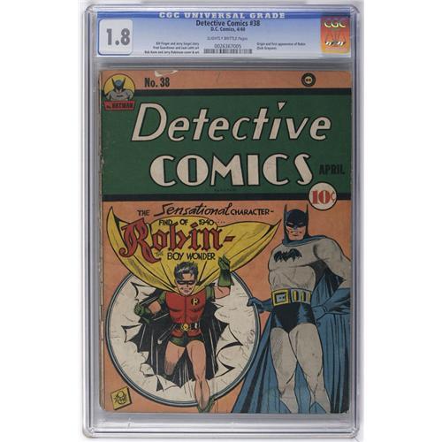 <B>Detective Comics #38 (DC, 1940) CGC GD- 1.8 Slightly brittle pages.</B></I> High-grade copies of the first appearance of Robin cost about the same as putting your kid through college (or your ward or sidekick as the case may be), so consider this more affordable copy so your collection's not without one of the most important Golden Age comic books. Not only was it significant, it had influence beyond this title, because it kicked off a "kid sidekick" craze throughout the other series and comics companies as well. This issue's art is by Bob Kane and Jerry Robinson, and Batman and Robin's repartee is courtesy of scripter Bill Finger. Overstreet 2006 GD 2.0 value = $3,611. CGC census 3/06: 2 in 1.8, 20 higher.