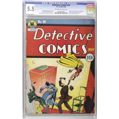 <B>Detective Comics #39 (DC, 1940) CGC FN- 5.5 Off-white to white pages.</B></I> In just the second <B>Detective</B></I> adventure for Robin, the youngster and his guardian Batman take on opium smugglers. Bob Kane and Jerry Robinson teamed up to draw the cover and the Batman story. Overstreet 2006 FN 6.0 value = $1,764. CGC census 10/06: 1 in 5.5, 4 higher.<BR><BR><b>Shipping:</b> Slabbed Comic (<a target="_blank" href="http://www.heritageauctions.com/common/shipping.php">view shipping information</a>)