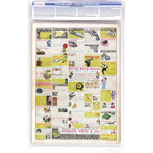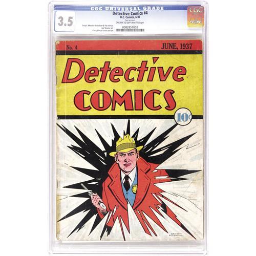 <B>Detective Comics #4 (DC, 1937) CGC VG- 3.5 Cream to off-white pages.</B></I> You could definitely call this a tough find in any grade - just one unrestored copy has been graded higher by CGC to date. The issue is a Gerber "8." Creig Flessel drew the issue's cover featuring Speed Saunders as well as the story featuring the character. Speed was not one to waste time - as readers learned: "In contrast to the methodical Sherlock Holmes type of sleuth, Speed relies on nerve and an uncanny sense of hunches!" Meanwhile, the Jerry Siegel/Joe Shuster team added two features to the issue. CGC notes, "Tape on cover." Overstreet 2006 VG 4.0 value = $1,900. CGC census 5/06: 2 in 3.5, 1 higher. <I>From the collection of Patrick Marchbanks.</B></I> <BR><BR><B>Important notice:</B> Heritage usually auctions material at the rate of 200-250 lots per hour. On some occasions eBay Live bid software or the Internet may not be able to keep up with the pace of the auction. We recommend placing a realistic absentee bid now as insurance to avoid disappointment. Occasionally the auctioneer may eliminate or reject an eBay Live bid, and the auctioneer may also reopen a lot after the close of the eBay live bidding (usually because we missed an audience bid), and may reject your bid even if it shows you as the winning bidder. By bidding via eBay Live, you agree that Heritage may award the lot to another bidder at its sole discretion under the circumstances described above or any other reasonable circumstances. Since eBay bids are not shown to us until we open the lot on the floor, we treat those bids just like floor bids. In most cases the floor responds before the eBay bid is presented to us, due to Internet lag time, so for consistency we have made it a policy that floor bids are always considered first over tie eBay live bids. Also please note that all Heritage lots purchased through eBay Live carry a 22.5% Buyer's Premium. Please make sure you read the Terms and Conditions before you bid. This lot is being auctioned in conjunction with a live floor auction by Heritage Auction Galleries. All final auction and invoice information will be supplied by Heritage Auction Galleries, and all other information should be considered preliminary. Lot:41001 <BR><BR><B>Winning Notification and Billing:</B> After the FINAL session in this auction is complete, Heritage will send e-mail and snail mail invoices. This process normally takes several days. All final auction and invoice information will be supplied by Heritage Auction Galleries, and all other information should be considered preliminary. <BR><BR>This auction will be conducted on a live auction floor and over the Internet through eBay Live. If you choose to place an absentee bid, please take a moment to <font color='#0000ff'><u><a href='http://pages.ebay.com/liveauctions/help/before/laabsentee.html'>learn how eBay Live absentee bidding works</a></u></font><font color='#000000'>