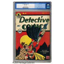 <B>Detective Comics #41 (DC, 1940) CGC VF- 7.5 Cream to off-white pages.</B></I> Robin the Boy Wonder finally got his first solo story three issues after his debut, enrolling at a boarding school to unravel a murder case (Batman does show up to lend a helping fist on the last couple of pages). In this early issue, the Dynamic Duo were still drawn by their creator Bob Kane (with help from Jerry Robinson), both on the cover and inside. Backup features include Speed Saunders (with Fred Guardineer art), Slam Bradley, and the Crimson Avenger. Only three copies of this issue have been certified with higher grades by CGC to date. Overstreet 2004 VF 8.0 value = $2,217. CGC census 12/04: 2 in 7.5, 3 higher. <I>From the Northern Lights Collection.</B></I>