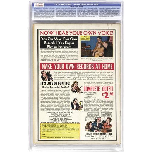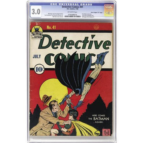 <B>Detective Comics #41 Davis Crippen ("D" Copy) pedigree (DC, 1940) CGC GD/VG 3.0 Off-white pages.</B></I> Three issues after his debut, Robin the Boy Wonder finally got his first solo story, enrolling at a boarding school to unravel a murder case (Batman does show up to lend a helping fist on the last couple of pages). In this early issue, the Dynamic Duo were still drawn by their creator Bob Kane (with help from Jerry Robinson), both on the cover and inside. Overstreet 2006 GD 2.0 value = $348; VG 4.0 value = $696. CGC census 7/06: 1 in 3.0, 15 higher. <I>From the Crippen Collection.</B></I> <BR><BR><B>Important notice:</B> Heritage usually auctions material at the rate of 200-250 lots per hour. On some occasions eBay Live bid software or the Internet may not be able to keep up with the pace of the auction. We recommend placing a realistic absentee bid now as insurance to avoid disappointment. Occasionally the auctioneer may eliminate or reject an eBay Live bid, and the auctioneer may also reopen a lot after the close of the eBay live bidding (usually because we missed an audience bid), and may reject your bid even if it shows you as the winning bidder. By bidding via eBay Live, you agree that Heritage may award the lot to another bidder at its sole discretion under the circumstances described above or any other reasonable circumstances. Since eBay bids are not shown to us until we open the lot on the floor, we treat those bids just like floor bids. In most cases the floor responds before the eBay bid is presented to us, due to Internet lag time, so for consistency we have made it a policy that floor bids are always considered first over tie eBay live bids. Also please note that all Heritage lots purchased through eBay Live carry a 22.5% Buyer's Premium. Please make sure you read the Terms and Conditions before you bid. This lot is being auctioned in conjunction with a live floor auction by Heritage Auction Galleries. All final auction and invoice information will be supplied by Heritage Auction Galleries, and all other information should be considered preliminary. Lot:41001 <BR><BR><B>Winning Notification and Billing:</B> After the FINAL session in this auction is complete, Heritage will send e-mail and snail mail invoices. This process normally takes several days. All final auction and invoice information will be supplied by Heritage Auction Galleries, and all other information should be considered preliminary. <BR><BR>This auction will be conducted on a live auction floor and over the Internet through eBay Live. If you choose to place an absentee bid, please take a moment to <font color='#0000ff'><u><a href='http://pages.ebay.com/liveauctions/help/before/laabsentee.html'>learn how eBay Live absentee bidding works</a></u></font><font color='#000000'>