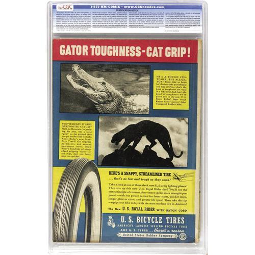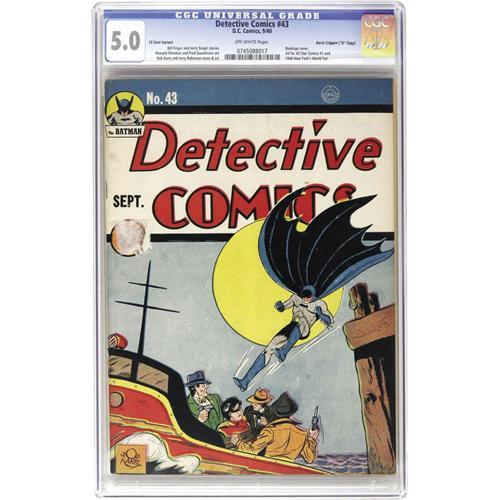 <B>Detective Comics #43 15 Cent Cover Variant - Davis Crippen ("D" Copy) pedigree (DC, 1940) CGC VG/FN 5.0 Off-white pages.</B></I> Now <I>here's</B></I> a real rarity! This comic is identical to the regular issue #43 in every respect, except for the 15-cent cover price! A 15-cent version of <B>Batman</B></I> #2, published the same year, is known to exist as well, and speculation has it that these were printed in the U.S. as part of the regular print run, yet intended for the Canadian market. Since this copy's got the remains of a sticker on top of the 15-cent price, it's reasonable to speculate that some of these copies had a 10-cent sticker applied on top of the higher price for domestic sale (Davis Crippen purchased his comics in the Washington D.C. area). Whatever the case, given the multiples of Guide that cover-price variants from the <I>Bronze</B></I> Age always seem to bring, what collector of such oddities could resist an honest-to-goodness <I>Golden</B></I> Age variant? Here's your chance to secure the only copy of the variant yet certified by CGC. Note that a small plastic stabilizing peg is loose inside the CGC holder, not affecting the comic itself or the integrity of the holder. Overstreet 2006 VG 4.0 value (for regular 10-cent edition) = $1,050; FN 6.0 value = $1,575. CGC census 7/06 (for 15-cent variant): 1 in 5.0, none higher. <I>From the Crippen Collection.</B></I> <BR><BR><B>Important notice:</B> Heritage usually auctions material at the rate of 200-250 lots per hour. On some occasions eBay Live bid software or the Internet may not be able to keep up with the pace of the auction. We recommend placing a realistic absentee bid now as insurance to avoid disappointment. Occasionally the auctioneer may eliminate or reject an eBay Live bid, and the auctioneer may also reopen a lot after the close of the eBay live bidding (usually because we missed an audience bid), and may reject your bid even if it shows you as the winning bidder. By bidding via eBay Live, you agree that Heritage may award the lot to another bidder at its sole discretion under the circumstances described above or any other reasonable circumstances. Since eBay bids are not shown to us until we open the lot on the floor, we treat those bids just like floor bids. In most cases the floor responds before the eBay bid is presented to us, due to Internet lag time, so for consistency we have made it a policy that floor bids are always considered first over tie eBay live bids. Also please note that all Heritage lots purchased through eBay Live carry a 22.5% Buyer's Premium. Please make sure you read the Terms and Conditions before you bid. This lot is being auctioned in conjunction with a live floor auction by Heritage Auction Galleries. All final auction and invoice information will be supplied by Heritage Auction Galleries, and all other information should be considered preliminary. Lot:41001 <BR><BR><B>Winning Notification and Billing:</B> After the FINAL session in this auction is complete, Heritage will send e-mail and snail mail invoices. This process normally takes several days. All final auction and invoice information will be supplied by Heritage Auction Galleries, and all other information should be considered preliminary. <BR><BR>This auction will be conducted on a live auction floor and over the Internet through eBay Live. If you choose to place an absentee bid, please take a moment to <font color='#0000ff'><u><a href='http://pages.ebay.com/liveauctions/help/before/laabsentee.html'>learn how eBay Live absentee bidding works</a></u></font><font color='#000000'>