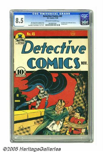 <B>Detective Comics #45 (DC, 1940) CGC VF+ 8.5 Off-white to white pages.</B></I> Nothing livens up a <B>Detective</B></I> issue quite like a Joker appearance, and this one's extra-special, as it was the fiend's first story appearance in this series (he had plied his villainous trade in the pages of <B>Batman</B></I> previously). So what's that Mad Master of Mirth, that Malicious Mountebank, that Hilarious Harlequin up to this time? He's undercover as "A. Rekoj," fooling some fellow criminals but not eluding the Dynamic Duo. Bob Kane, Jerry Robinson, and George Roussos teamed up on the art. The book also has seven other tales of crimefighting, with the indefatigable Slam Bradley and Speed Saunders both making it 45 issues in a row. Overstreet 2005 VF 8.0 value = $2,243; VF/NM 9.0 value = $3,622. CGC census 3/05: 3 in 8.5, 3 higher.