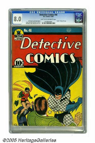 <B>Detective Comics #46 (DC, 1940) CGC VF 8.0 Light tan to off-white pages.</B></I> This sharp-looking copy, with its "laughing" Batman cover, features the death of Hugo Strange, the Dark Knight's first major villain. Art comes courtesy of Bob Kane, Howard Sherman, Irwin Hasen, and Jerry Robinson; Fred Ray illustrated a text piece. Overstreet 2005 VF 8.0 value = $1,444. CGC census 7/05: 3 in 8.0, 1 higher.