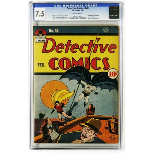 <B>Detective Comics #48 (DC, 1941) CGC VF- 7.5 Off-white pages.</B></I> The term "Batmobile" was used for the first time in this issue! Believe it or not, the car was still a red roadster at this point, which only underlines what an early Bat-story this is. The obsessive Bat-fan will also want to note that while Gotham City had been mentioned in <B>Batman</B></I> before, its first <B>Detective</B></I> mention was in this issue. The art on Batman is a Bob Kane/Jerry Robinson/George Roussos team-up. And those artists also collaborated on the lead story inside the book. In addition to the Batman tale, there are backup features starring the usual assortment of shamuses, spies, and superheroes. Overstreet 2005 VF 8.0 value = $1,444. CGC census 12/05: 2 in 7.5, 4 higher.