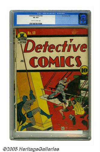 <B>Detective Comics #53 (DC, 1941) CGC VG 4.0 Cream to off-white pages.</B></I> Bob Kane and Jerry Robinson art. Modest grade but displays nice cover colors. Overstreet 2005 VG 4.0 value = $308. CGC census 6/05: 1 in 4.0, 7 higher.