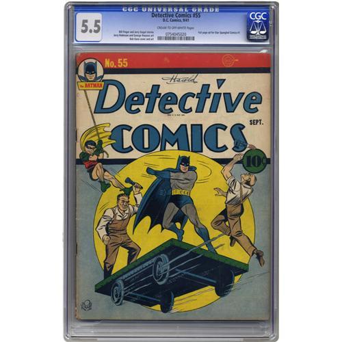 <B>Detective Comics #55 (DC, 1941) CGC FN- 5.5 Cream to off-white pages.</B></I> Batman and Robin serving up punches and kicks with a smile was a common sight in years to come, but this was one of the first few "all-grins" covers, coming on the heels of much grimmer fare. Inside the book, the two star heroes are backed up by a host of other detective tales, most starring more traditional gumshoes. Overstreet 2006 FN 6.0 value = $477. CGC census 3/06: 2 in 5.5, 5 higher. <I>From the Collection of Harold Curtis.</B></I>