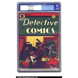 Detective Comics #57 (DC, 1941) CGC VF/NM 9.0 Off-white to white pages. This fantastic early Detective is a joy to behold. It's not a pedigree comic but has the same deep, vivid colors and sharp appearance of any "name" book. Slight staple stress and a small bindery tear at the top left corner are the only defects. This bondage cover is guaranteed to stir excitement in the heart of any Bat-fan. Overstreet 2002 NM 9.4 value = $1,600. Important notice: We expect to be auctioning lots at the rate of 200-250 per hour. Sometimes eBay Premier live bid software cannot keep up with that pace, so we strongly recommend that you place a realistic proxy bid now as insurance to avoid disappointment. Also please note that all Heritage/CAA lots purchased through eBay Premier carry a 20% Buyer's Premium. Please make sure you read the Terms and Conditions.