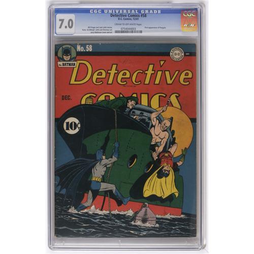 <B>Detective Comics #58 (DC, 1941) CGC FN/VF 7.0 Cream to off-white pages.</B></I> The Penguin waddled into his first appearance here, taking the first step to becoming one the few comic villains who's a household name. The character had his signature look from the very start, in a story drawn by Bob Kane, Robinson, and George Roussos. The usual assortment of backup stories includes the last installment of the Speed Saunders feature which had been appearing in this title since issue #1. The cover is by Fred Ray and Jerry Robinson. Overstreet 2006 FN 6.0 value = $1,269; VF 8.0 value = $2,820. CGC census 2/06: 1 in 7.0, 6 higher. <I>From the Collection of Harold Curtis.</B></I>