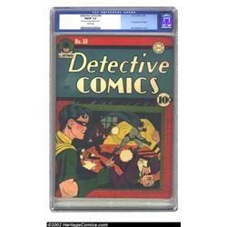 Detective Comics #59 (DC, 1942) CGC 7.0 FN/VF Cream pages. Batman dishes out a couple of knuckle sandwiches, while his partner Robin looks on adoringly. This great Golden Age comic features the second appearance of the Penguin. Cover by the incomparable Jerry Robinson. CGC notes, "Very minor amount of glue on cover." Overstreet 2002 FN 6.0 value = $492; VF 8.0 value = $1,023. Important notice: We expect to be auctioning lots at the rate of 200-250 per hour. Sometimes eBay Premier live bid software cannot keep up with that pace, so we strongly recommend that you place a realistic proxy bid now as insurance to avoid disappointment. Also please note that all Heritage/CAA lots purchased through eBay Premier carry a 20% Buyer's Premium. Please make sure you read the Terms and Conditions.