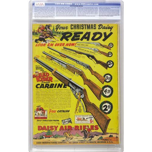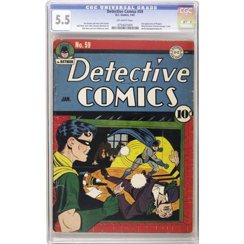 <B>Detective Comics #59 (DC, 1942) CGC FN- 5.5 Off-white pages.</B></I> The second Penguin issue in a row was just his second appearance overall! Bob Kane and Jerry Robinson drew the issue's cover in addition to providing the art on the Batman story. Also in this issue, Crimson Avenger's pal Wing becomes a costumed sidekick for the first time -- more of him would be seen in the concurrently published <B>Leading Comics</B></I> #1. Overstreet 2006 FN 6.0 value = $510. CGC census 10/06: 3 in 5.5, 13 higher.<BR><BR><b>Shipping:</b> Slabbed Comic (<a target="_blank" href="http://www.heritageauctions.com/common/shipping.php">view shipping information</a>)