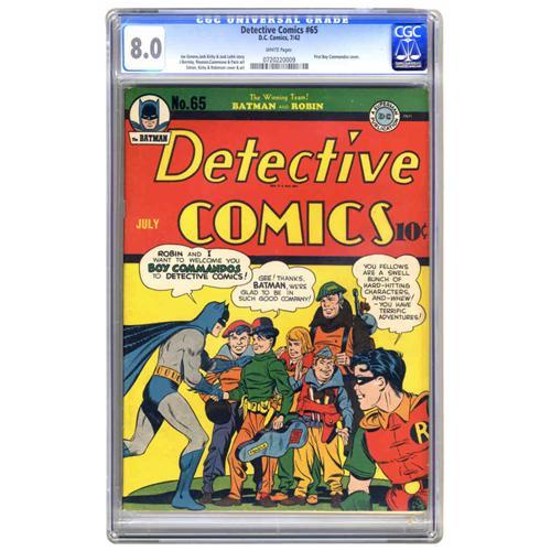 <B>Detective Comics #65 (DC, 1942) CGC VF 8.0 White pages.</B></I> The first cover appearance of the Boy Commandos is a collaboration of no less than <I>four</B></I> great artists -- Simon and Kirby on the kid group and Fred Ray and Jerry Robinson on Batman and Robin. And no copy of this issue has been certified with a higher grade by CGC to date. Overstreet 2005 VF 8.0 value = $1,925. CGC census 11/05: 2 in 8.0, none higher.