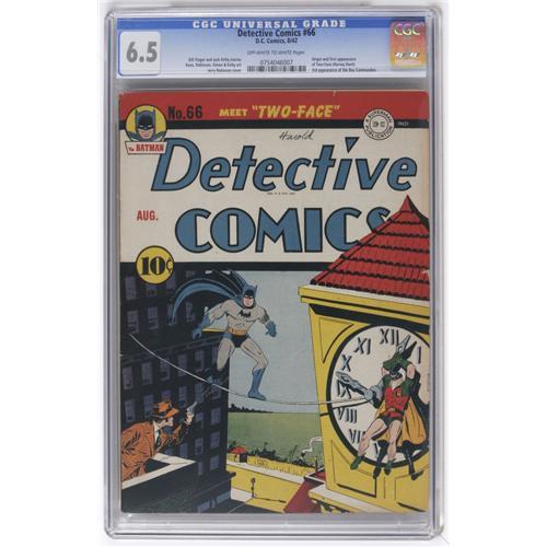 <B>Detective Comics #66 (DC, 1942) CGC FN+ 6.5 Off-white to white pages.</B></I> Two-Face, one of the most inspired villains in all the DC Universe, made his first appearance here. We also find out the origin of the man once known as Harvey Kent (and yes, we did say Harvey <I>Kent</B></I>, only later was it changed to Harvey <I>Dent</B></I>!). The issue's cover and art are by Jerry Robinson. There's also a Boy Commandos adventure by Simon and Kirby. Overstreet 2006 FN 6.0 value = $1,122; VF 8.0 value = $2,431. CGC census 3/06: 2 in 6.5, 7 higher. <I>From the Collection of Harold Curtis.</B></I>