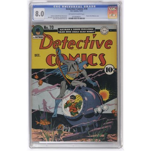 <B>Detective Comics #70 (DC, 1942) CGC VF 8.0 Off-white to white pages.</B></I> A standout Jerry Robinson cover leads off this issue. Inside the mag, Batman encounters "The Man Who Could Read Minds," and things really get hairy when the guy reads Batman's mind and finds out his secret identity! A Boy Commandos story is among the many backup features. Overstreet 2006 VF 8.0 value = $775. CGC census 3/06: 3 in 8.0, 5 higher. <I>From the Collection of Harold Curtis.</B></I>