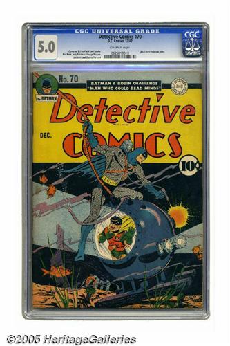 <B>Detective Comics #70 (DC, 1942) CGC VG/FN 5.0 Off-white pages.</B></I> Underwater cover by Jerry Robinson. Boy Commandos story by Simon and Kirby. Overstreet 2005 VG 4.0 value = $246; FN 6.0 value = $369. CGC census 7/05: 2 in 5.0, 13 higher.