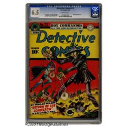 <B>Detective Comics #73 (DC, 1943) CGC FN+ 6.5 Off-white pages.</B></I> The Scarecrow, who first menaced Batman in the pages of <B>Worlds' Finest</B></I>, is back, making his first-ever cover appearance. This is one Scarecrow who doesn't while away the hours consultin' with the flowers, rather he's embarking on a crime wave in which all of the crimes involve three-letter words. There's a grade-A backup feature as well, with Simon and Kirby contributing a Boy Commandos yarn. The Batman cover and Kane interior art are by Bob Kane, Jerry Robinson, and George Roussos. Overstreet 2004 FN 6.0 value = $396; VF 8.0 value = $825. CGC census 12/04: 1 in 6.5, 6 higher.