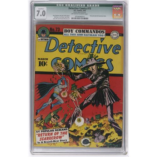 <B>Detective Comics #73 (DC, 1943) CGC Qualified FN/VF 7.0 Off-white to white pages.</B></I> First and only Golden Age Scarecrow cover. Bob Kane, Jerry Robinson, and George Roussos cover and art. Boy Commandos backup feature. CGC notes, "Center 2 wraps detached." Overstreet 2006 GD 2.0 value = $137; VG 4.0 value = $274; FN 6.0 value = $411; VF 8.0 value = $856. <I>From the Collection of Harold Curtis.</B></I>