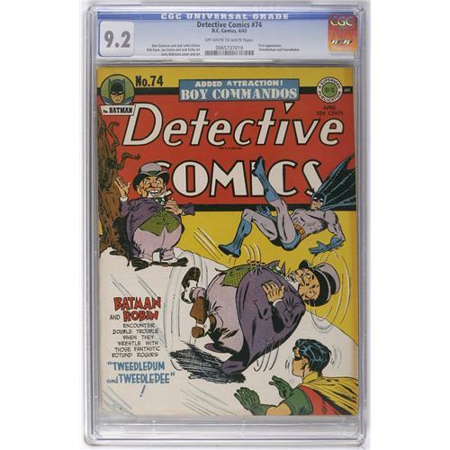 <B>Detective Comics #74 (DC, 1943) CGC NM- 9.2 Off-white to white pages.</B></I> Tweedledum and Tweedledee, two lookalike cousins with a love for all things criminal, made their first appearance in this issue. Jerry Robinson drew the Dynamic Duo (and the Corpulent Duo) on the cover and inside the issue. The great condition of this copy makes it easy to forget it's a pretty early issue, so early that Batman still shared the book with a multitude of other features. The Boy Commandos (by Simon and Kirby, no less), Air Wave, Slam Bradley, and the Crimson Avenger are among the other features. Overstreet 2006 NM- 9.2 value = $1,500. CGC census 3/06: 1 in 9.2, 1 higher.