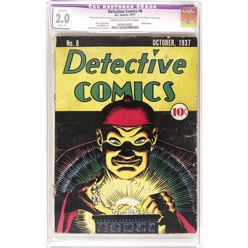 <B>Detective Comics #8 (DC, 1937) CGC Apparent GD 2.0 Slight (P) Cream to off-white pages.</B></I> Overstreet and CGC agree that the Creig Flessel cover is a bona fide classic, while <B>The Photo-Journal Guide to Comic Books</B></I> designates the issue "scarce". Jerry Siegel and Joe Shuster contributed to this pre-<B>Action</B></I> #1 book. CGC notes, "Restoration includes: tear seals to interior. (3 pieces of tape on cover, 6 pieces of tape on interior cover)" Overstreet 2006 GD 2.0 value = $1,025. <I>From the collection of Patrick Marchbanks</B></I>. <BR><BR><B>Important notice:</B> Heritage usually auctions material at the rate of 200-250 lots per hour. On some occasions eBay Live bid software or the Internet may not be able to keep up with the pace of the auction. We recommend placing a realistic absentee bid now as insurance to avoid disappointment. Occasionally the auctioneer may eliminate or reject an eBay Live bid, and the auctioneer may also reopen a lot after the close of the eBay live bidding (usually because we missed an audience bid), and may reject your bid even if it shows you as the winning bidder. By bidding via eBay Live, you agree that Heritage may award the lot to another bidder at its sole discretion under the circumstances described above or any other reasonable circumstances. Since eBay bids are not shown to us until we open the lot on the floor, we treat those bids just like floor bids. In most cases the floor responds before the eBay bid is presented to us, due to Internet lag time, so for consistency we have made it a policy that floor bids are always considered first over tie eBay live bids. Also please note that all Heritage lots purchased through eBay Live carry a 22.5% Buyer's Premium. Please make sure you read the Terms and Conditions before you bid. This lot is being auctioned in conjunction with a live floor auction by Heritage Auction Galleries. All final auction and invoice information will be supplied by Heritage Auction Galleries, and all other information should be considered preliminary. Lot:41001 <BR><BR><B>Winning Notification and Billing:</B> After the FINAL session in this auction is complete, Heritage will send e-mail and snail mail invoices. This process normally takes several days. All final auction and invoice information will be supplied by Heritage Auction Galleries, and all other information should be considered preliminary. <BR><BR>This auction will be conducted on a live auction floor and over the Internet through eBay Live. If you choose to place an absentee bid, please take a moment to <font color='#0000ff'><u><a href='http://pages.ebay.com/liveauctions/help/before/laabsentee.html'>learn how eBay Live absentee bidding works</a></u></font><font color='#000000'>