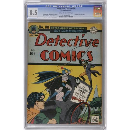 <B>Detective Comics #80 (DC, 1943) CGC VF+ 8.5 Off-white to white pages.</B></I> "The End of Two Face?" Well, kinda -- in this issue (only his third appearance overall), he undergoes surgery to get his normal face back. The real Two-Face wouldn't be seen again in comics for 11 years, though a couple of impostors showed up in the interim. Bob Kane and Jerry Robinson are credited with the cover art. The issue also has a Boy Commandos story by the Simon and Kirby team. Overstreet 2006 VF 8.0 value = $800; VF/NM 9.0 value = $1,263. CGC census 3/06: 2 in 8.5, 4 higher. <I>From the Collection of Harold Curtis.</B></I>