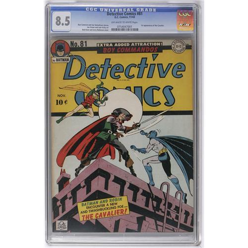 <B>Detective Comics #81 (DC, 1943) CGC VF+ 8.5 Off-white to white pages.</B></I> This is the first time we've seen a high-grade copy of this issue, and it's got the first appearance of that Romantic Rogue, that Swashbuckling Swordsman of Crime, the Cavalier! Simon and Kirby handled art chores on the Boy Commandos backup feature. Note that the CGC holder has a 1 1/2-inch crack on the back and side, not affecting the integrity of the holder. Overstreet 2006 VF 8.0 value = $581; VF/NM 9.0 value = $916. CGC census 2/06: 1 in 8.5, 2 higher. <I>From the Collection of Harold Curtis.</B></I>