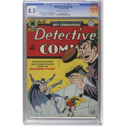 <B>Detective Comics #82 (DC, 1943) CGC VF+ 8.5 Off-white to white pages.</B></I> By far the nicest copy we've seen of this issue, this one is near the top of CGC's census as well. In the issue, Batman and Robin take on "The Quarterback of Crime," whose gimmick is to apply football tactics to his gang's villainy. As you can see on the Bob Kane/Jerry Robinson cover, the Caped Crusader responds in kind (no thanks to Robin, who lines up on the wrong side of the kicker)! Joining the huddle are Simon and Kirby, who drew the Boy Commandos feature. Overstreet 2006 VF 8.0 value = $581; VF/NM 9.0 value = $916. CGC census 2/06: 1 in 8.5, 3 higher. <I>From the Collection of Harold Curtis.</B></I>