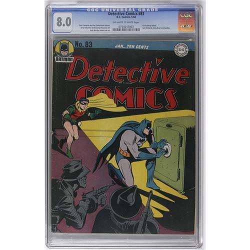 <B>Detective Comics #83 (DC, 1944) CGC VF 8.0 Off-white to white pages.</B></I> This issue's dark front cover (with art by Jack Burnley) is the reason that higher-grade issues are hard to come by! This issue features the debut of the "new look" Alfred (skinny and moustached as opposed to fat and clean-shaven). The reason for the switch isn't any alternate-worlds mumbo-jumbo -- he just goes to a health spa to lose some weight! As for the backup features, the CGC notation "last Simon & Kirby Boy Commandos" isn't quite correct, but this is the last of the unbroken run of S&K tales, with most future installments the work of various ghosts. Overstreet 2006 VF 8.0 value = $650. CGC census 2/06: 1 in 8.0, 2 higher. <I>From the Collection of Harold Curtis.</B></I>