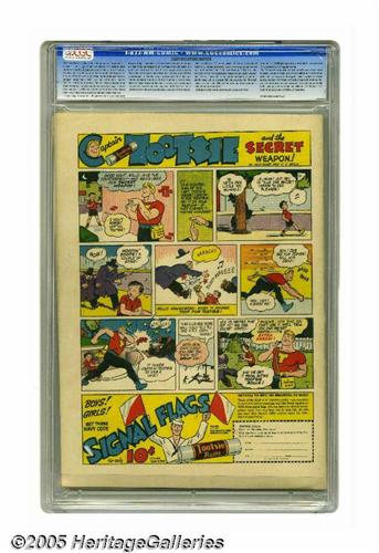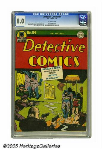 <B>Detective Comics #84 (DC, 1944) CGC VF 8.0 Off-white pages.</B></I> This funny Dick Sprang cover was a welcome sight, all the more so because it's an issue we don't see very often -- only six unrestored copies have been certified by CGC to date. The story "Artists in Villainy" deals with a school that teaches criminals how to ply their lawbreaking trade; the Dynamic Duo aims to ensure that class is dismissed! Backup features include the Boy Commandos, Slam Bradley, the Crimson Avenger, and Air Wave. Overstreet 2005 VF 8.0 value = $575. CGC census 6/05: 1 in 8.0, 2 higher.