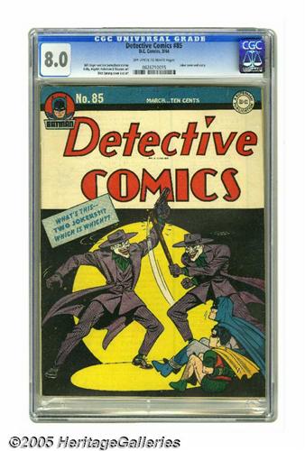 <B>Detective Comics #85 (DC, 1944) CGC VF 8.0 Off-white to white pages.</B></I> Two Mirthful Menaces? Two Grim Jesters? Two Brazen Buffoons? Well, there's really only one Joker, but in this issue he does have to deal with a copycat who's impersonating him to go on a crime spree. The real Joker's hopping mad about it, and he'll bust the phony even if it means siding with the Dynamic Duo! The issue's cover and Batman art are by Dick Sprang, and there's also a Boy Commandos story with art by the "King" himself, Jack Kirby. Also of note is that this was the last installment of the Spy backup feature, a Jerry Siegel/Joe Shuster creation that debuted way back in issue #1. Overstreet 2005 VF 8.0 value = $756. CGC census 4/05: 1 in 8.0, 4 higher.