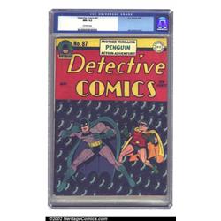 Detective Comics #87 (DC, 1944) CGC NM- 9.2 Off-white pages. Dick Sprang's inventive cover has the Dynamic Duo standing against a background of penguins. Guess who's making a guest-villain appearance? This pretty cover is the proud owner of the highest grade CGC has assigned to date for issue #87. Overstreet 2002 NM 9.4 value = $1,000. Important notice: We expect to be auctioning lots at the rate of 200-250 per hour. Sometimes eBay Premier live bid software cannot keep up with that pace, so we strongly recommend that you place a realistic proxy bid now as insurance to avoid disappointment. Also please note that all Heritage/CAA lots purchased through eBay Premier carry a 20% Buyer's Premium. Please make sure you read the Terms and Conditions.