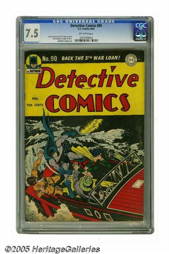 <B>Detective Comics #90 (DC, 1944) CGC VF- 7.5 Off-white pages.</B></I> Dick Sprang created this cover and also provided interior art for this issue, as did George Roussos and Martin Naydel. Overstreet 2005 VF 8.0 value = $575. CGC census 6/05: 1 in 7.5, 5 higher.