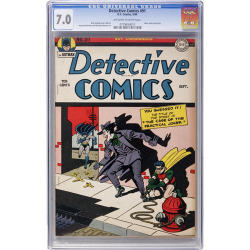 <B>Detective Comics #91 (DC, 1944) CGC FN/VF 7.0 Off-white to white pages.</B></I> This Dick Sprang-drawn Joker cover has Batman's ward giving the Harlequin of Hate a dose of his own medicine. Sprang, George Roussos and Henry Boltinoff added interior art. Overstreet 2006 FN 6.0 value = $357; VF 8.0 value = $744. CGC census 3/07: 2 in 7.0, 12 higher. <I> From the Cary and Cheryl Porter Collection.</B></I><BR><BR><b>Shipping:</b> Comics - Slabbed (certified) (<a target="_blank" href="http://www.heritageauctions.com/common/shipping.php">view shipping information</a>)