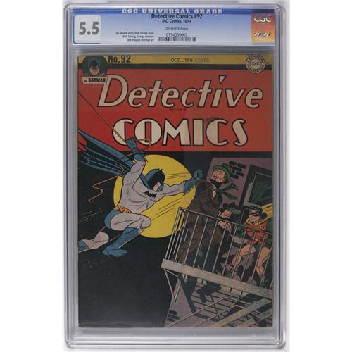 <B>Detective Comics #92 (DC, 1944) CGC FN- 5.5 Off-white pages.</B></I> Dick Sprang cover and art. Overstreet 2006 FN 6.0 value = $234. CGC census 1/06: 2 in 5.5, 6 higher. <I>From the Collection of Harold Curtis.</B></I>