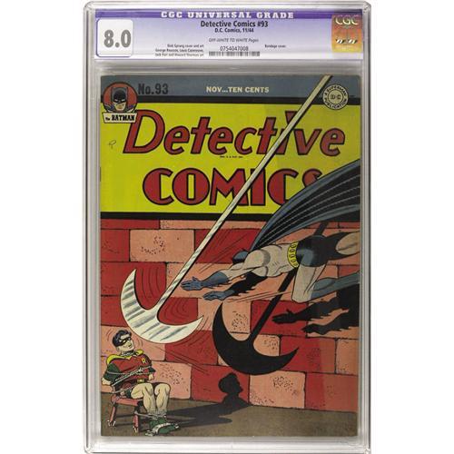 <B>Detective Comics #93 (DC, 1944) CGC VF 8.0 Off-white to white pages.</B></I> This copy missed out on being the highest-graded by the thinnest of margins, with the census-topper as of this writing being just a notch higher at 8.5. This is the nicest copy of the book we've seen, and a spectacular Dick Sprang cover makes the issue a real eye-catcher. Sprang handled the issue's interior art as well. The Boy Commandos, Air Wave, and Slam Bradley also appear. Overstreet 2006 VF 8.0 value = $488. CGC census 5/06: 2 in 8.0, 1 higher. <BR><BR><B>Important notice:</B> Heritage usually auctions material at the rate of 200-250 lots per hour. On some occasions eBay Live bid software or the Internet may not be able to keep up with the pace of the auction. We recommend placing a realistic absentee bid now as insurance to avoid disappointment. Occasionally the auctioneer may eliminate or reject an eBay Live bid, and the auctioneer may also reopen a lot after the close of the eBay live bidding (usually because we missed an audience bid), and may reject your bid even if it shows you as the winning bidder. By bidding via eBay Live, you agree that Heritage may award the lot to another bidder at its sole discretion under the circumstances described above or any other reasonable circumstances. Since eBay bids are not shown to us until we open the lot on the floor, we treat those bids just like floor bids. In most cases the floor responds before the eBay bid is presented to us, due to Internet lag time, so for consistency we have made it a policy that floor bids are always considered first over tie eBay live bids. Also please note that all Heritage lots purchased through eBay Live carry a 22.5% Buyer's Premium. Please make sure you read the Terms and Conditions before you bid. This lot is being auctioned in conjunction with a live floor auction by Heritage Auction Galleries. All final auction and invoice information will be supplied by Heritage Auction Galleries, and all other information should be considered preliminary. Lot:41001 <BR><BR><B>Winning Notification and Billing:</B> After the FINAL session in this auction is complete, Heritage will send e-mail and snail mail invoices. This process normally takes several days. All final auction and invoice information will be supplied by Heritage Auction Galleries, and all other information should be considered preliminary. <BR><BR>This auction will be conducted on a live auction floor and over the Internet through eBay Live. If you choose to place an absentee bid, please take a moment to <font color='#0000ff'><u><a href='http://pages.ebay.com/liveauctions/help/before/laabsentee.html'>learn how eBay Live absentee bidding works</a></u></font><font color='#000000'>