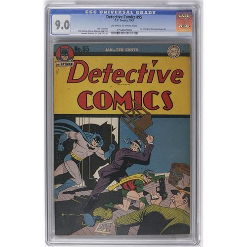<B>Detective Comics #95 (DC, 1945) CGC VF/NM 9.0 Off-white to white pages.</B></I> Batman drawn by Dick Sprang and the Boy Commandos drawn by Jack Kirby were quite a one-two punch for just one thin dime! Air Wave and Slam Bradley also appear. The issue's cover is by Bob Kane and George Roussos. Overstreet 2006 VF/NM 9.0 value = $769; NM- 9.2 value = $1,050. CGC census 1/06: 1 in 9.0, 3 higher. <I>From the Collection of Harold Curtis.</B></I>