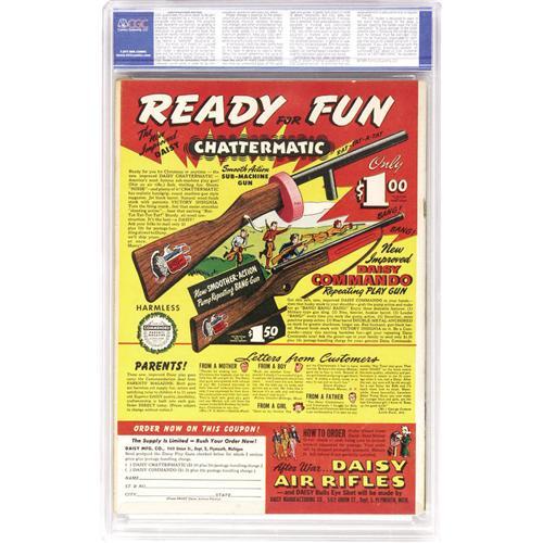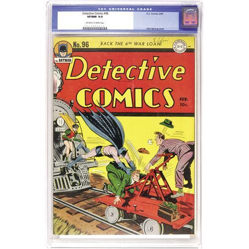 <B>Detective Comics #96 (DC, 1945) CGC VF/NM 9.0 Off-white to white pages.</B></I> Following some cover laughs courtesy of Dick Sprang, this issue turns its spotlight toward our favorite butler, Alfred! Miffed that he can't join in the crimefighting, Alfred takes a vacation only to go into business as a private eye! He calls himself "Alfred Beagle" in the story; it's unclear whether this is supposed to be the revelation of his real name (as Overstreet construes it) or simply the name he assumes for his P.I. work, at any rate it's the first time the character used any last name at all. Overstreet 2006 VF/NM 9.0 value = $769; NM- 9.2 value = $1,050. CGC census 5/06: 3 in 9.0, 4 higher. <I>From the collection of Patrick Marchbanks.</B></I> <BR><BR><B>Important notice:</B> Heritage usually auctions material at the rate of 200-250 lots per hour. On some occasions eBay Live bid software or the Internet may not be able to keep up with the pace of the auction. We recommend placing a realistic absentee bid now as insurance to avoid disappointment. Occasionally the auctioneer may eliminate or reject an eBay Live bid, and the auctioneer may also reopen a lot after the close of the eBay live bidding (usually because we missed an audience bid), and may reject your bid even if it shows you as the winning bidder. By bidding via eBay Live, you agree that Heritage may award the lot to another bidder at its sole discretion under the circumstances described above or any other reasonable circumstances. Since eBay bids are not shown to us until we open the lot on the floor, we treat those bids just like floor bids. In most cases the floor responds before the eBay bid is presented to us, due to Internet lag time, so for consistency we have made it a policy that floor bids are always considered first over tie eBay live bids. Also please note that all Heritage lots purchased through eBay Live carry a 22.5% Buyer's Premium. Please make sure you read the Terms and Conditions before you bid. This lot is being auctioned in conjunction with a live floor auction by Heritage Auction Galleries. All final auction and invoice information will be supplied by Heritage Auction Galleries, and all other information should be considered preliminary. Lot:41001 <BR><BR><B>Winning Notification and Billing:</B> After the FINAL session in this auction is complete, Heritage will send e-mail and snail mail invoices. This process normally takes several days. All final auction and invoice information will be supplied by Heritage Auction Galleries, and all other information should be considered preliminary. <BR><BR>This auction will be conducted on a live auction floor and over the Internet through eBay Live. If you choose to place an absentee bid, please take a moment to <font color='#0000ff'><u><a href='http://pages.ebay.com/liveauctions/help/before/laabsentee.html'>learn how eBay Live absentee bidding works</a></u></font><font color='#000000'>