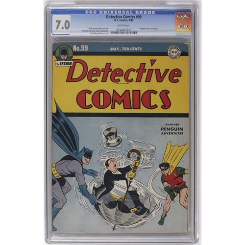 <B>Detective Comics #99 (DC, 1945) CGC FN/VF 7.0 White pages.</B></I> Dick Sprang drew that Bumbershoot Bandit, the Penguin, on both this issue's cover and the accompanying story. Slam Bradley, Air Wave, and the Boy Commandos round out the issue's line-up. Overstreet 2006 FN 6.0 value = $357; VF 8.0 value = $744. CGC census 1/06: 1 in 7.0, 9 higher. <I>From the Collection of Harold Curtis.</B></I>