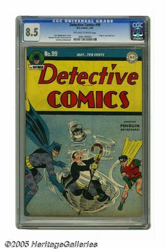 <B>Detective Comics #99 (DC, 1945) CGC VF+ 8.5 Off-white to white pages.</B></I> Appearances by the Penguin rivaled the popularity of those of the Joker in this title. Dick Sprang gives the villain life on this cover and in an inside story. To date CGC has certified just three copies of #99 with higher grades than this lovely exemplar. Overstreet 2005 VF 8.0 value = $719; VF/NM 9.0 value = $1,110. CGC census 6/05: 2 in 8.5, 3 higher.