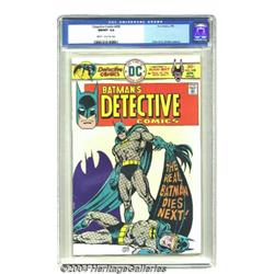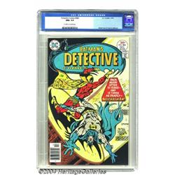 <B>Detective Comics Group (DC, 1975-78) Average grade: CGC NM+ 9.6.</B></I> The seven issues in this group are CGC NM+ 9.6 with off-white to white pages, except as noted, including #466, 469, 470; #447 and 473 (off-white pages); #458 (CGC NM/MT 9.8 off-white to white pages); #476 (CGC NM 9.4 off-white to white pages). Issue #466 is the first appearance of Signalman since <B>Batman</B></I> #139. Issue #469 is the introduction and origin of Dr. Phosphorous, with art by Walter Simonson. Issue #476 features a Joker cover and story, with art by Marshall Rogers. Overstreet 2004 NM- 9.2 value for group = $210. 7 Comic Books <BR><BR><B>Important notice:</B> Heritage usually auctions material at the rate of 200-250 lots per hour. On some occasions eBay Live bid software or the Internet may not be able to keep up with the pace of the auction. We recommend placing a realistic absentee bid now as insurance to avoid disappointment. Occasionally the auctioneer may eliminate or reject an eBay Live bid, and the auctioneer may also reopen a lot after the close of the eBay live bidding (usually because we missed an audience bid), and may reject your bid even if it shows you as the winning bidder. By bidding via eBay Live, you agree that Heritage may award the lot to another bidder at its sole discretion under the circumstances described above or any other reasonable circumstances. Since eBay bids are not shown to us until we open the lot on the floor, we treat those bids just like floor bids. In most cases the floor responds before the eBay bid is presented to us, due to Internet lag time, so for consistency we have made it a policy that floor bids are always considered first over tie eBay live bids. Also please note that all Heritage lots purchased through eBay Live carry a 20% Buyer's Premium. Please make sure you read the Terms and Conditions before you bid.