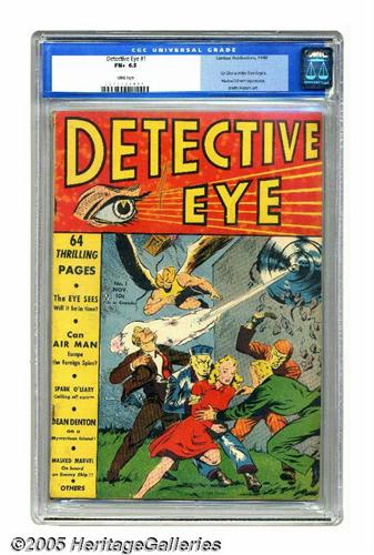 <B>Detective Eye #1 (Centaur, 1940) CGC FN+ 6.5 White pages.</B></I> The Eye, Air Man, and the Masked Marvel, all former stars of <B>Keen Detective Funnies</B></I>, headlined the two-issue run of this title. The cover is by Lew Glanzman. Overstreet 2005 FN 6.0 value = $645; VF 8.0 value = $1,344. CGC census 6/05: 1 in 6.5, 4 higher.