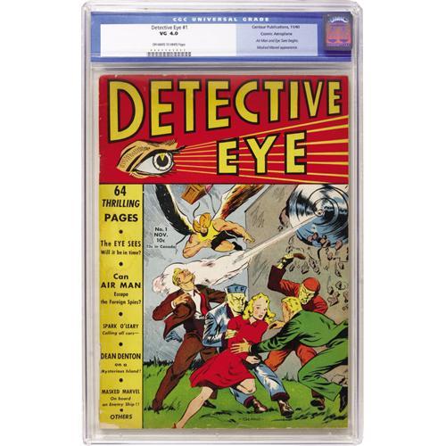 <B>Detective Eye #1 Cosmic Aeroplane pedigree (Centaur, 1940) CGC VG 4.0 Off-white to white pages.</B></I> Louis Glanzman is an illustrator of no small renown, but long before he painted covers for <B>Time</B></I>,<B> </B></I>he was a teenage comic book artist! Glanzman drew this issue's cover. This series features some of the best characters from <B>Keen Detective Funnies</B></I>, which had ceased its run by this time. Overstreet 2006 VG 4.0 value = $444. CGC census 3/07: 1 in 4.0, 10 higher.<BR><BR><b>Shipping:</b> Comics - Slabbed (certified) (<a target="_blank" href="http://www.heritageauctions.com/common/shipping.php">view shipping information</a>)