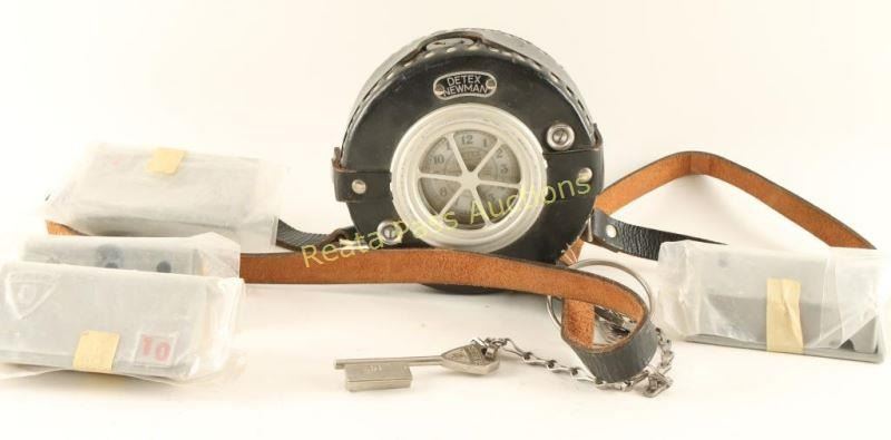 NEWMAN Watchclock, a 24 hour dial model. In very good condition, has its leather case. Signed on the front: "DETEX Corporation Made in USA New Braunfels Texas". Measures 6" across. Includes leather strap with chain and keys and four checkpoints. DETEX CORPORATION has its origins in a predecessor company established in the 1870's by A. A. Newman to manufacture and sell stationary watchclocks. Thus, DETEX has observed over 130 years of involvement in the Watchclock industry.