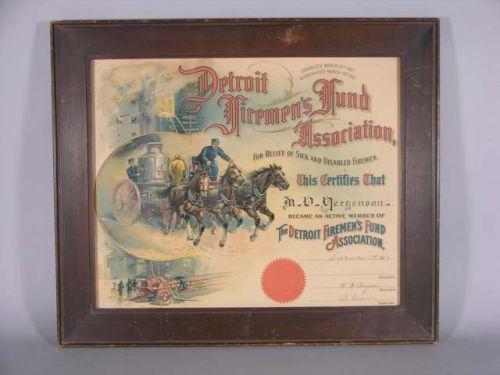 Detroit fireman's fund assoc. certificate, dated 1916 (red seal), 16" x 13" Ex. cond.