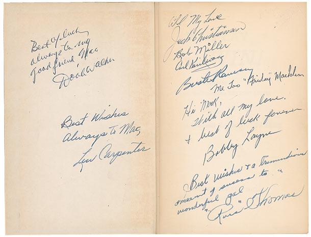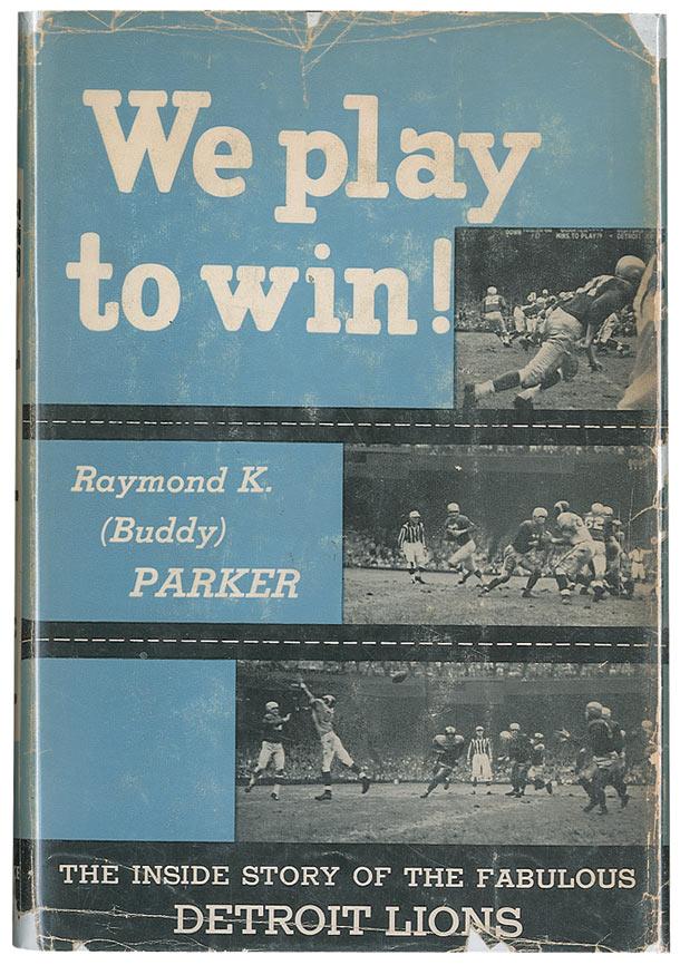 Signed book: We Play To Win. First edition. New Jersey: Prentice-Hall, 1955. Hardcover with dustjacket, 5.75 x 8.5, 213 pages. Signed on both pastedowns and end pages by 17 Lions, including Bobby Layne, Doak Walker (ins), Lew Carpenter, Jack Christiansen, Bob Miller, Buster Ramsey, ‘Friday’ Macklem, ‘Russ’ Thomas, George Wilson, Aldo Forte, Bud Parker, Jim Doran, Joe Schmidt, and Dick Stanfel. In very good condition, with toning and foxing to signed pages, a mild shade of toning to inside pages, and wear and tear to dustjacket.