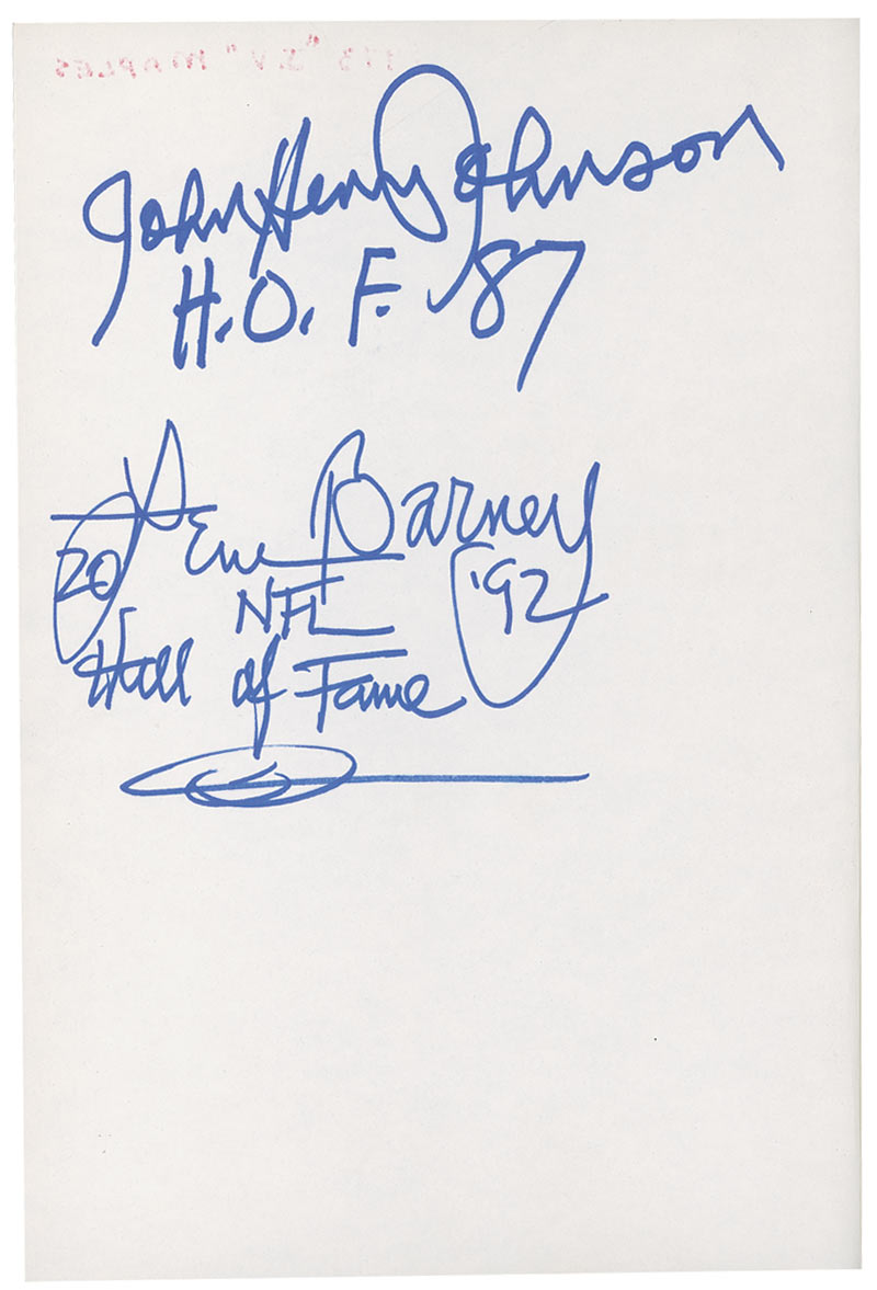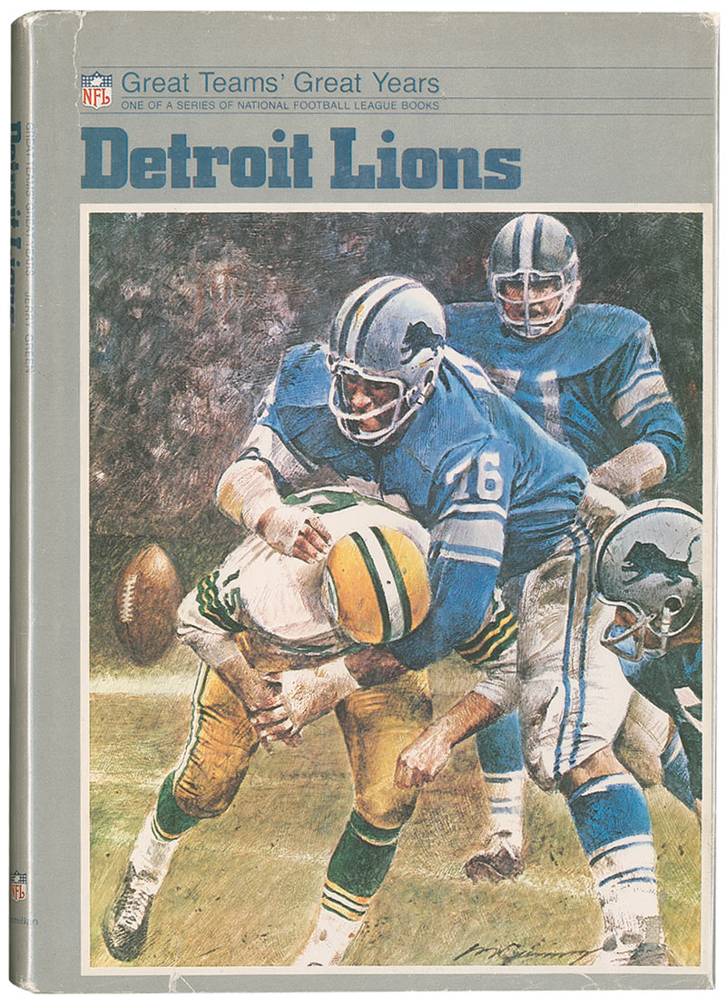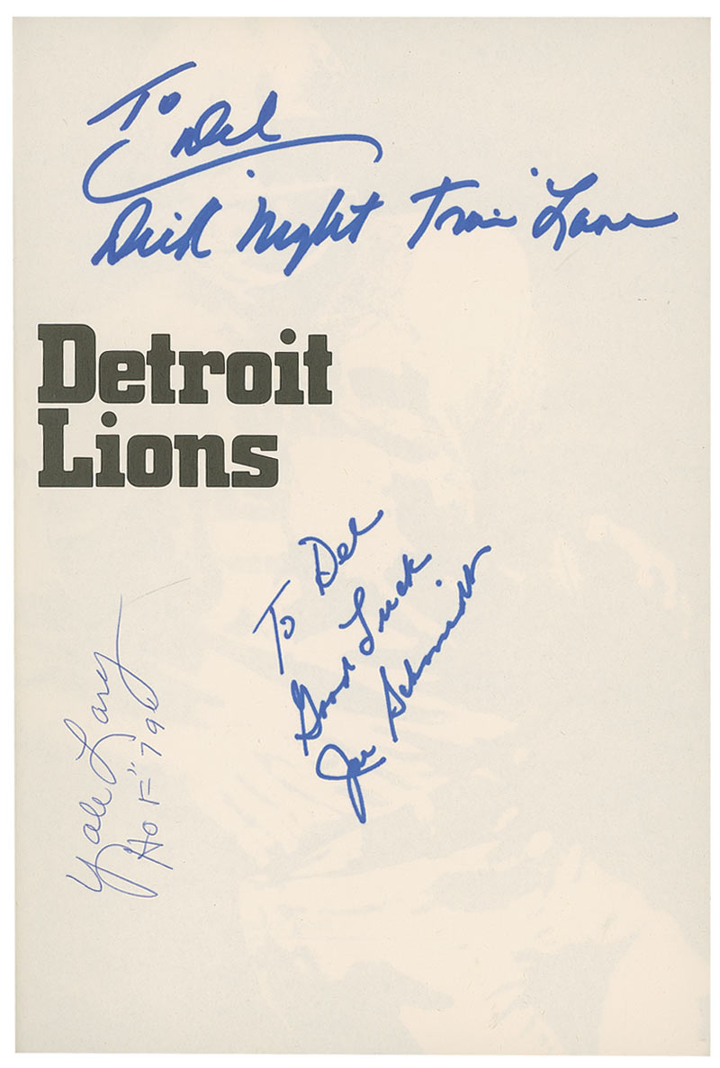 Signed book: Detroit Lions by Jerry Green. First edition. NY: Macmillan Publishing Co., Inc., 1973. Hardcover with dustjacket, 7.25 x 10.25, 191 pages. Signed on the half-title page and opposite page in blue felt tip by Dick ‘Night Train’ Lane (ins), Joe Schmidt (ins), Lem Barney (adding “20, NFL Hall of Fame ‘92”), John Henry Johnson (adding “H.O.F. 87”), and signed in blue ballpoint by Yale Lary (adding “HOF 79”). In fine condition, with light show-through from a collector notation on the first free end page and clipped price corner and light wear to the dustjacket.