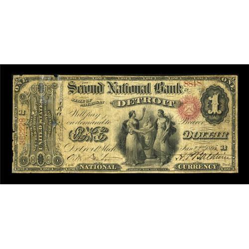 <B>Detroit, MI</B></I> - $1 Original Fr. 380 <B>The Second NB</B></I> Ch. # 116<BR> This bank only issued First Charter notes prior to bowing out in 1883. The left side of the note has had some notable tape restoration work in order to remain intact. <B>Very Good</B></I>, restored.<BR><BR><b>Shipping:</b> Coins & Currency (<a target="_blank" href="http://www.heritageauctions.com/common/shipping.php">view shipping information</a>)